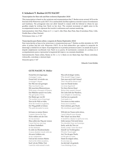 This transcription is based on the variations and ornamentations that T. Boehm wrote around 1870 on the first lied of the Winterreise cycle (1827). It is a melancholic lied that explores a traveler’s sense of rootlessness and loneliness. The protagonist does not allow himself to remain with his beloved to whom he says goodbye simply by writing Gute Nacht on her door. The constant movement of eighth notes in the accompaniment seems to represent the traveler’s restlessness and constant wandering.