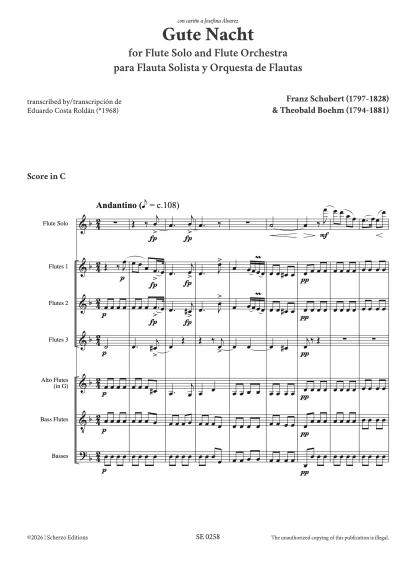 Instrumentation: Solo Flute, Flutes in C 1, 2 and 3, Alto Flute, Bass Flute, Bass (Contrabass Flute, Cello, Double Bass or Bass Clarinet).
